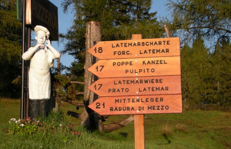 Karerpass Latemarspitze etwa 1000 Meter Höhenunterschied. Da sind wir in drei Stunden oben haben die Wanderer geschätzt.