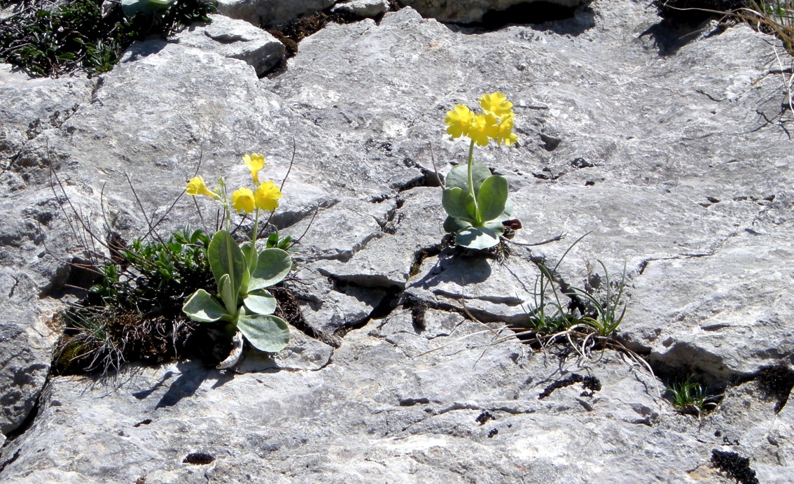 Auf der felsigen Seite des Grüntengipfels stets ein paar schöne Flühblumen (Felsenaurikel, Bergbadenger).