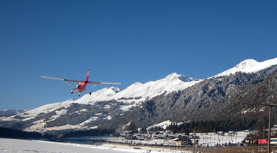 Nach fuenf Tagen Wind, Wolken und Schneefall Sonne! Los! Auf die Piste! Beim Schuhschnüren will eine Bandscheibe raus! So bleibt dem Schweiztouristen nur der Spaziergang. Gleich am Flugplätzchen Reichenbach fliegt einer so dicht über den Spaziergänger, dass er ihn herunterholen könnte.