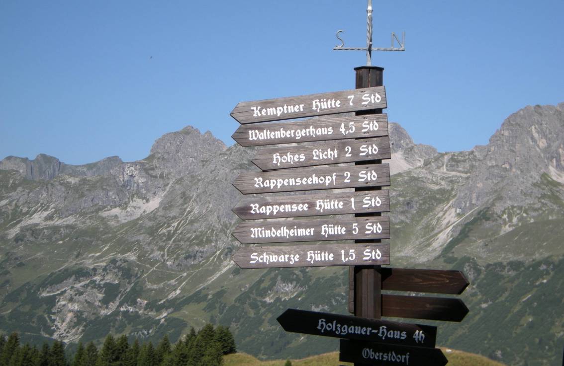 Bis zur Enzianhütte hier drei Stunden aufgestiegen hat jetzt der Wanderer noch die große Auswahl.Rappensee Hütte? Oder Rappenseehütte - Bastian Sick fragen!