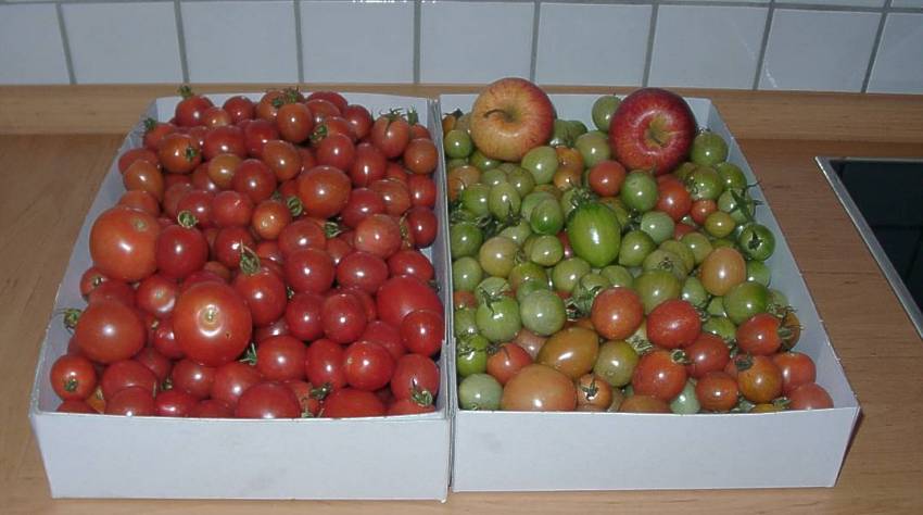 Selbst Ende November gibt es noch viele Tomaten. Vor dem ersten Frost grün geerntet reifen sie warm und dunkel gestellt gut nach. Die Äpfel beschleunigen das Reifen.