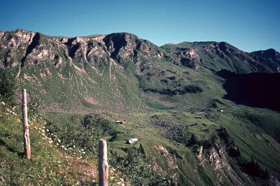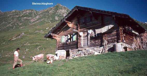 Das Steinschlaghorn, ein völlig unbedeutender Gipfel in der Niesenkette (Niesen 2362 m, weltbekannt laut Wanderbuch) mit 4.45 angegeben, ist von ganz unten anzugehen. Kein Sträßchen und erst recht keine Bahn dient als Aufstiegshilfe. Von Frutigen 4-6 Stunden hinauf begegnet man nur zufällig einem Menschen. |