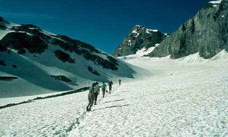 Über die weiße Fläche hinauf bis zur Lötschenhütte, damals, 1980! Bereits etwa 10 Jahre später war der Gletscher nicht mehr begehbar. Der Weg wurde nach links in die Felsen verlegt.