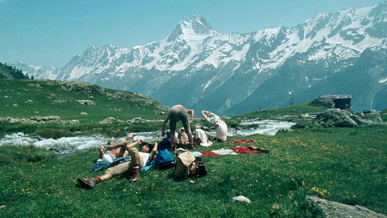 Das kommt nach der Passbezwingung natürlich wie gerufen: Ein Rastlatz am Wässerchen - Kummenalp. Doch nach Ferden hinununter werden die Wanderer nicht getragen, das geht noch eine Weile mit eigener Kraft. Dann gibt es den Bus nach Goppenstein, das Züggli nach Kandersteg, das Auto nach Scharnachtal.