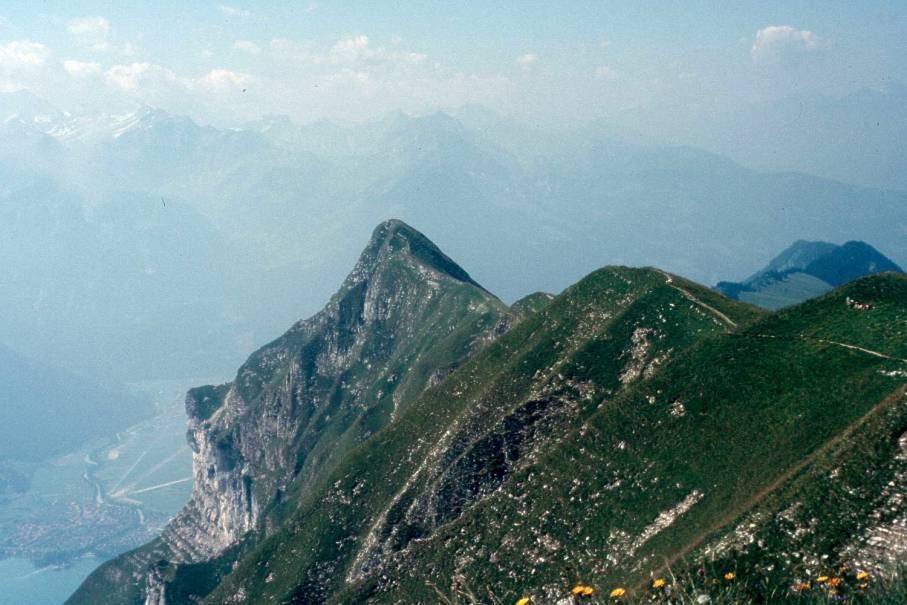 Da vorn auf der Spitze, dem Suggiturm, erreicht der Aufsteigende den Gratweg. Weiteres Filmmaterial hat der Fotograf gespart. Der Grund: Schauen Sie in die Berge! Dunstig. Die herrliche Aussicht in die “richtigen Berge” bleibt uns heute verwehrt.
