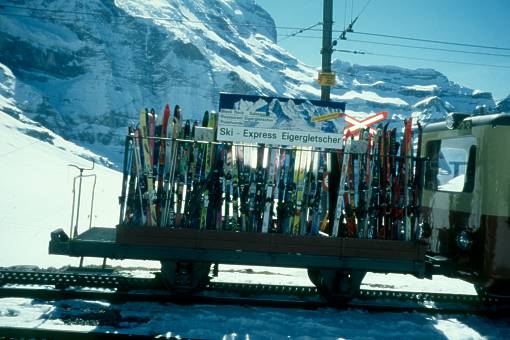 Grindelwald-Grund - Kleine ScheideggExpress ist natürlich übertrieben, aber so werden die Ski nach oben transportiert. Ob da jeder seine wieder findet?