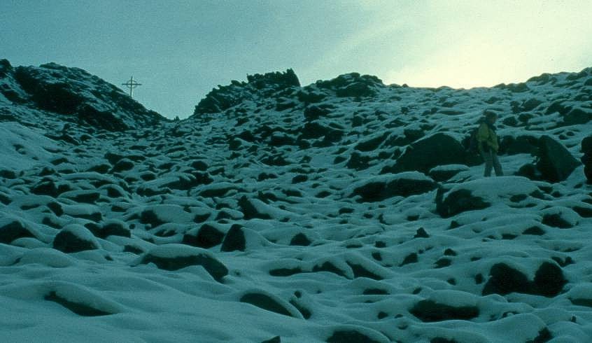 “Hinten” geht es hinunter. Hier kommen die Handschuhe zum Einsatz (sofern man sie mit hat). Fast eine Stunde über teils mit Schnee und teils mit Eis bedecktem groben Geröll geht es hinten hinunter.