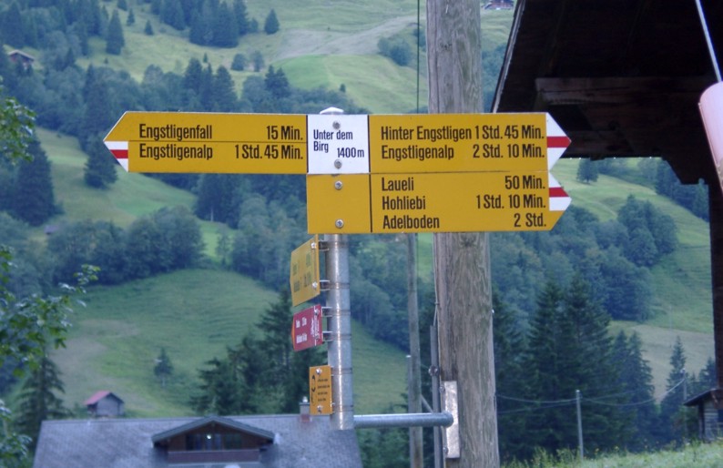In Adelboden, Unter dem Birg, sind die vielen möglichen Wanderungen von oder über die Engstligenalp gar nicht angeschrieben: zum Engstligengrat, zum Kindbettipass, zum Ammertenspitz, in das Üschinental, nach Lenk oder gar auf das Tierhörnli (nicht markiert).