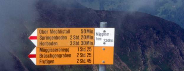 Der Gipfelwegweiser. Das Tschiparellenhorn ist nicht angeschrieben.Hinunter zum Parkplatz Mäggisserenegg nur 1 Std. 25 Min., aber mächtig abwärts.