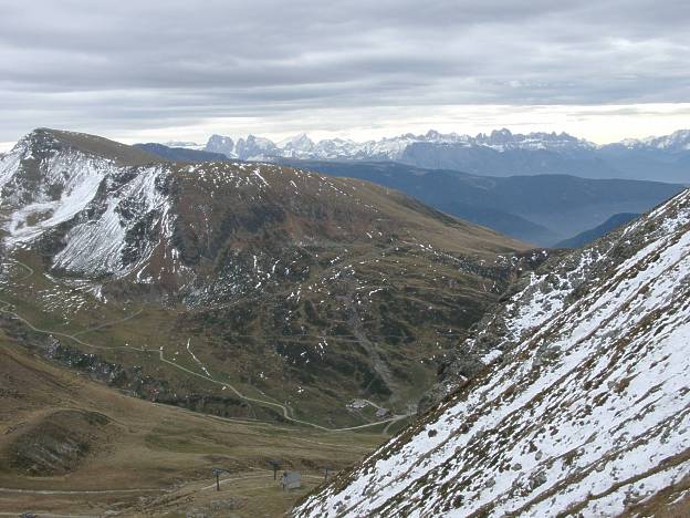 Links der Gipfel ist wohl der Mittager, im Hintergrund die Dolomiten.