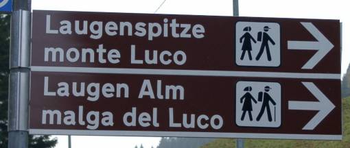 Wer ist für diese Schilder zuständig? Die gleiche Frage hat sich mir schon einmal auf Klammeben vor dem schönen Hirzer gestellt. Siehe Teil Hirzer. Natürlich nicht der Alpenverein, sondern der “Verein” der Wirtsleute. Auch hier führt der direkte Weg zur Laugenspitze bereits hinter der ersten Wegbiegung gerade hinauf (133). Schild und Weg im Oktober 2002 allerdings arg vernachlässigt. Der Weg auf dem Fahrsträßchen über die Laugenalm zur Laugenspitze groß ausgeschildert. Nun, wie sollten sonst die Wanderer zur Tränke kommen?