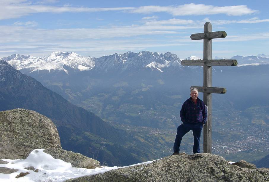 Nur ein Vorgipfel unter der mächtigen Zielspitze. Doch herrliche Aussicht nach Meran 2000 (was immer das auch genau sein soll), in die Dolomiten (bei guter Sicht) und zu den ersten Bergen der Ortlergruppe.Der Ohrnknott, 2258 m.