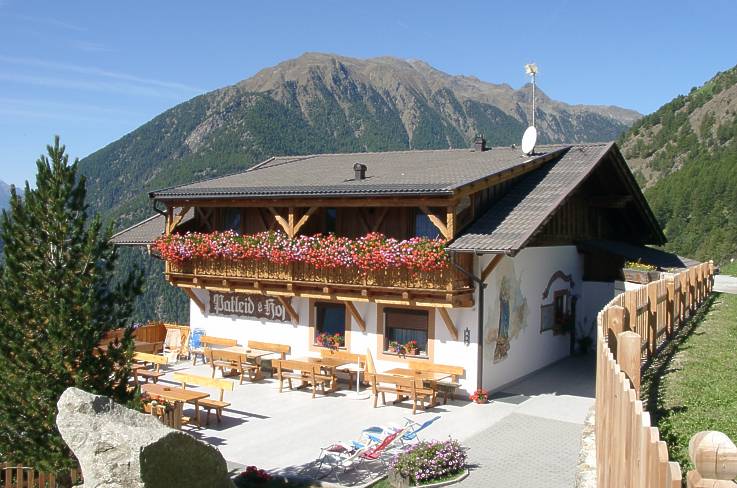 Das erste Training, der erste Weg im Herbst 2003 führt von Naturns auf Pfad Nr.10 über Unterstell, Patleidhof, Linthof zum Meraner Höhenweg. Der Patleidhof neu gestylt. Wer möchte da nicht auch einkehren? Doch in Unterstell will man Geld für eine neue Bahn und sie haben aus unerfindlichen Gründen den Touristentransport eingestellt. Also in und über Unterstell kaum Gäste.