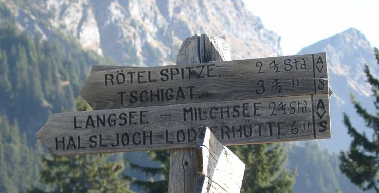 Am Hochgangshaus mutmachende Bergwegbeschilderung: Rötelspitze nur 2 1/2 Stunden. Doch bis zu diesem Wegweiser ist der Wanderer von der Leiteralm kommend bereits 1 1/2 Stunden unterwegs.