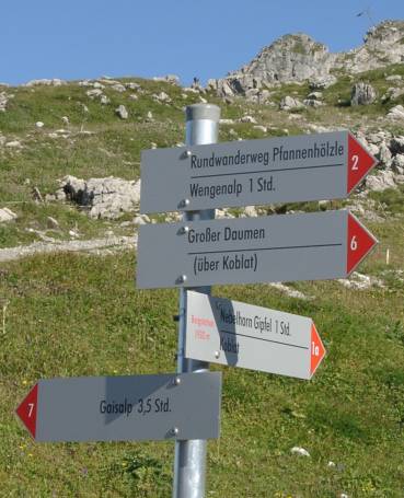 Schilder an der Nebelhornbahn HöfatsblickNeue Schilder haben sie gemacht. Doch zum Großen Daumen gleich die wichtige Information, wie weit ist es, vergessen.