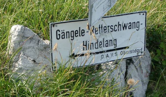 Über dem Geißalpsee gabelt sich das Auf- und Abpfädlein. Die Annahme, dass doch hier nun endlich der Entschenkopf ausgeschildert ist, wird nicht erfüllt. Gängele steht da. Was mag das wohl sein? Also muss hier der, der den Weg zum ersten Mal geht, die Karte befragen. Und siehe da, über das Gängele geht es nicht nur in das Retterschwanger Tal, sonder auch zum Entschenkopf. Das Schild darüber hat die Oberstdorfer Schildererneuerung 2002 noch nicht erreicht.