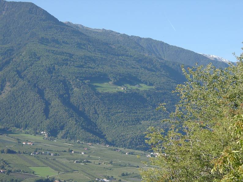 Blick vom Meraner Höhenweg zum Nörderberg.Ob das Stück Wiese oben im Wald gegenüber wirklich eine Familie ernährt?