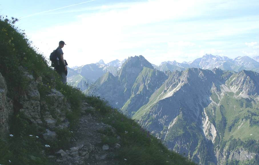 Den Höfats, nein, die Höfats mit ihren vier Gipfeln stets gegenüber. Der Blick hinunter bis in das Oytal.