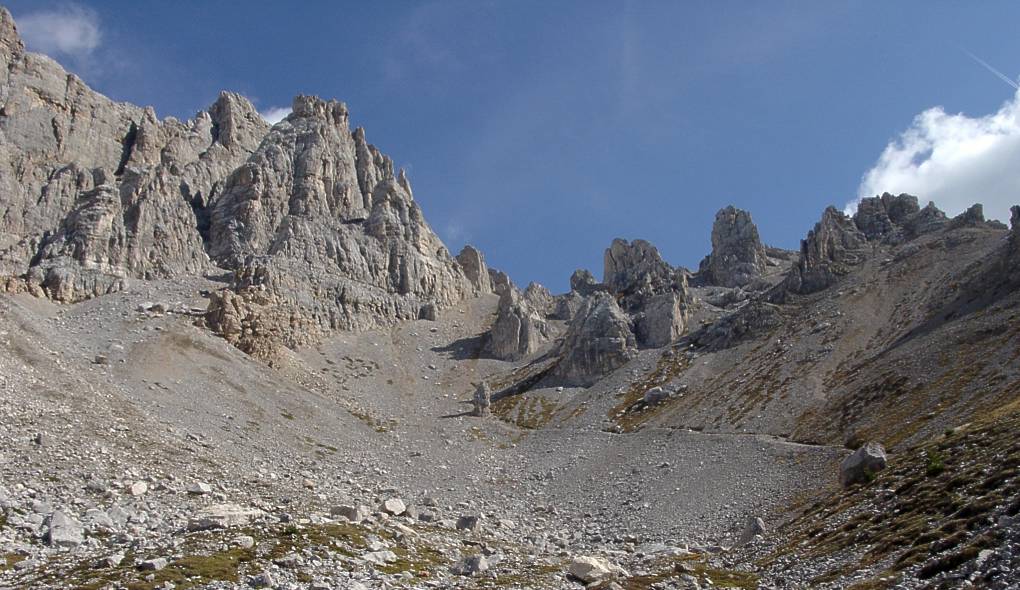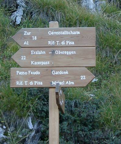 Tour: Sessellift Obereggen Bergstation - Gamsstallscharte - Pisahütte - Bergstation. Marschzeit 5 Stunden. Anspruchsvoll.