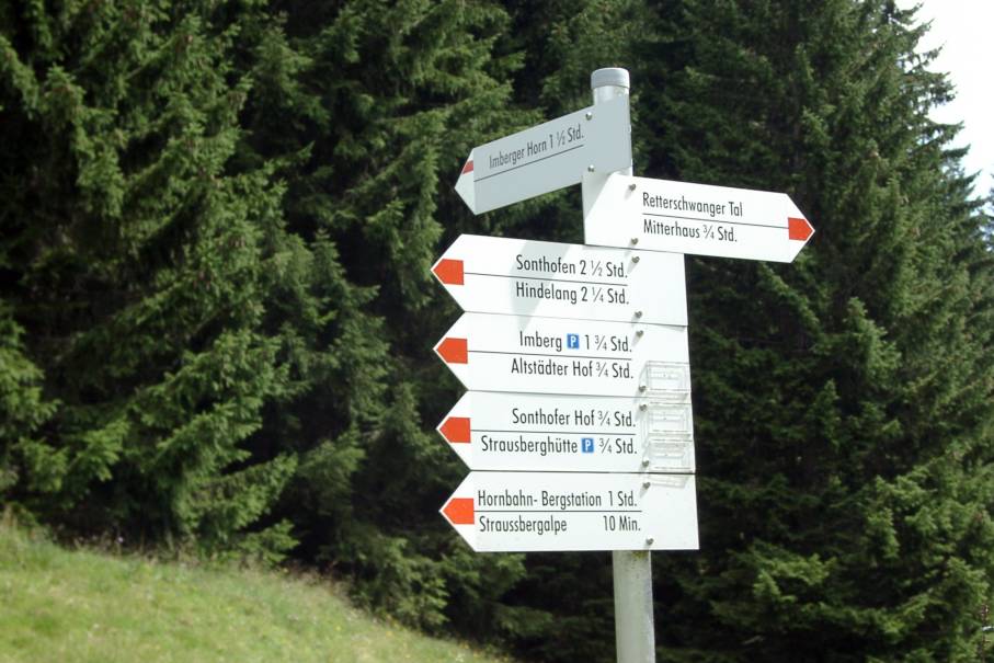 Wo mag der Wegweiser nur stehen? Ist das hier der Straussbergsattel? Die Hornbahn-Talstation ist vorsichtshalber gar nicht angeschrieben, 2 1/4?