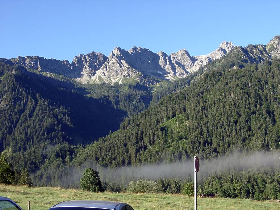 Bereits morgens um 08.00 Uhr auf dem Parkplatz alle Gipfel über Hinterstein zum Greifen nahe (Geishorn 4 1/2 Stunden). Der Wanderer ärgert sich bereits mächtig, dass er nicht den ersten Bus, 07.15, zum Giebelhaus genommen hat. |