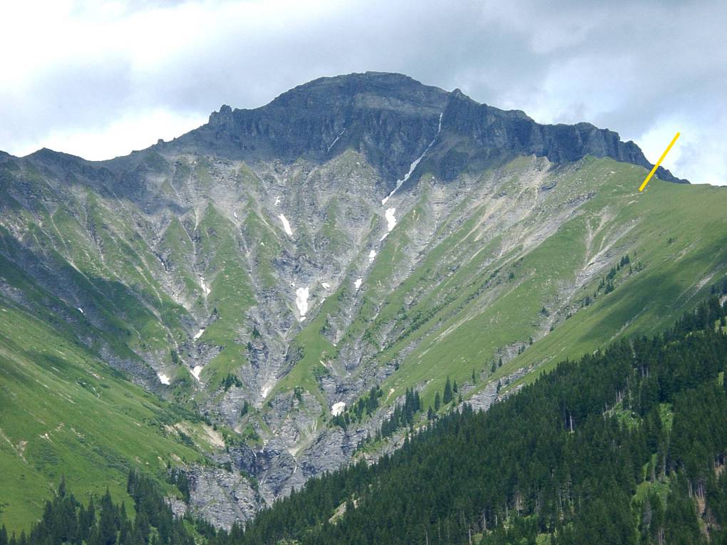 Durch die Rinnen des Gsür führt von der Schwanfeldspitze zur Furgelialp ein schöner Bergwanderweg. Ob dort oben bei der gelben Markierung der Einstieg ist? |
