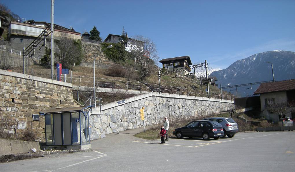 Bahnhof Eggerberg: Der Zug nach Goppenstein-Kandersteg hält auf der “Talseite”.