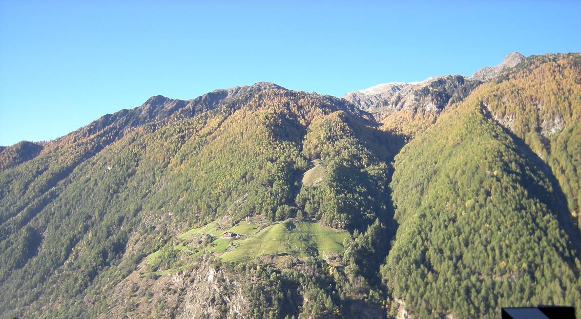 Von Katharinaberg nach Lint, fast das schönste Stück Meraner HöhenwegDem Meraner Höhenweg gegenüber eine Alm an einsamen Platz.