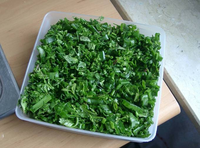 Damit liegen die Kräuterzutaten für meine “Grüne Soße” im zeitigen Frühjahr fest: -viele Zwiebel- und Knoblauchblätter von allen vorhandenen Pflanzen, -Sauerampfer soviel der Garten hergibt, -Pimpernelle oder Pimpinelle soviel wie der Gärtner Geduld zum Zupfen hat, -Zitronenmelisse zwei Spitzen mit je vier Blättern, -Petersilie kann und -Gartenkresse was schon zu finden ist.