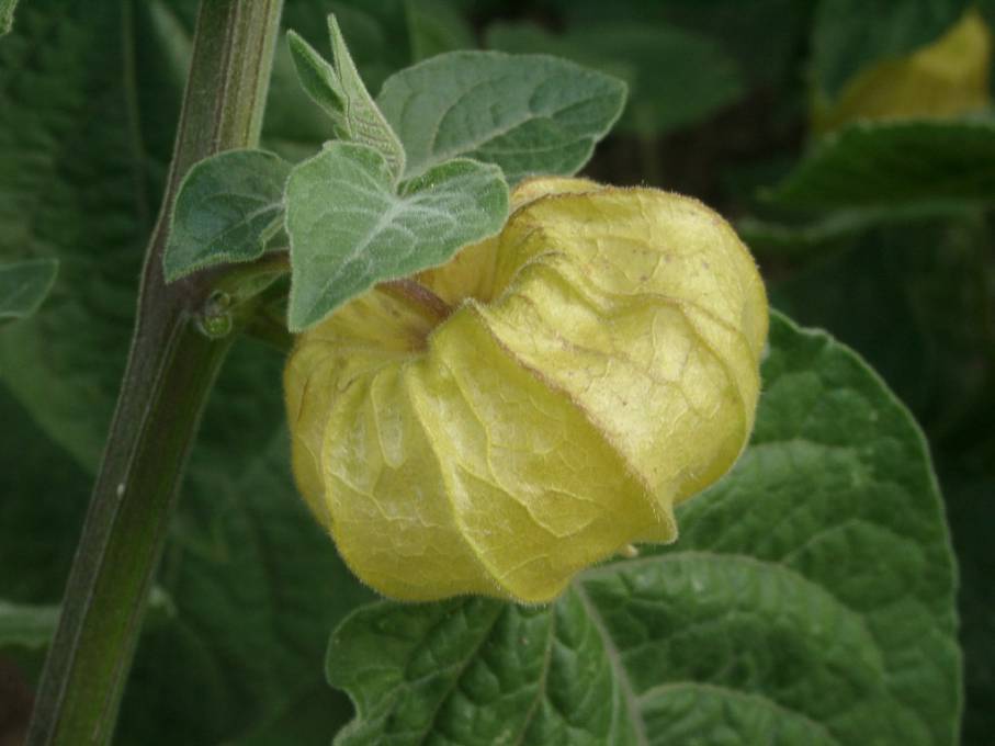 Andenbeere. Umgekehrt reziprok - Frucht zur Hülle. Die kleine Frucht lohnt den Anbau nicht.